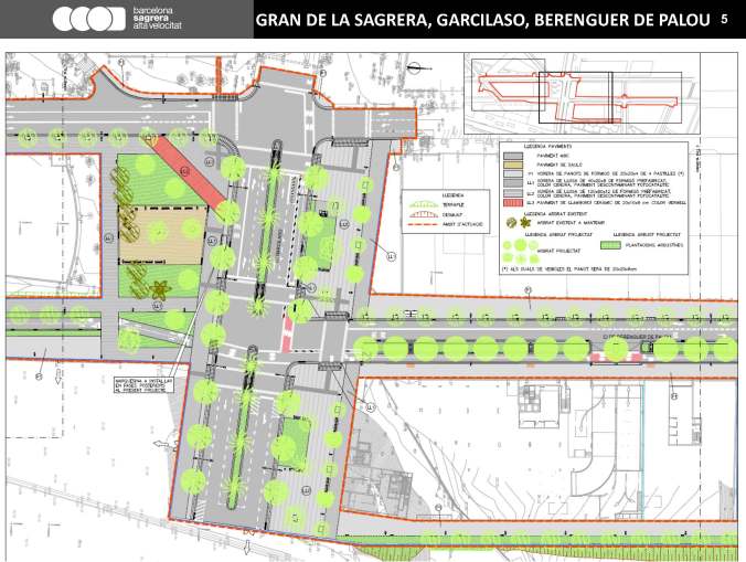 construcció de l’estació, que segueixen avançant, lentament, a dia d’avui. Les dades econòmiques que es mouen en aquest projecte ens diuen que aquestes urbanitzacions comptaran amb un pressupost de 6,9 milions d’euros, dels quals l’Ajuntament n’aportarà 1,76 milions, i els 5,14 restants provenen de les quotes ur-banístiques derivades del sector en transformació de l’Entorn Sagrera. La previsió és que les actuacions finalitzin el primer trimestre de 2021 (qui sap si les podrem donar per acabades i inaugurades a les Festes de la Primavera d’aquell any). En concret, el carrer Gran de la Sagrera –tram Costa Rica-Gar-cilaso– tindrà una calçada central formada per tres carrils i dos sentits de circulació –carril mixt en sentit sud, carril de vehi-cles en sentit nord i carril bus en sentit nord–. Hem de dir, com a AVV, que no som partidaris d’aquest doble sentit i esperem que en un futur, quan les vies que han d’envoltar l’estació estiguin acabades, el carrer Gran de la Sagrera pugui pacificar-se com s’ha fet amb l’homòleg de Sant Andreu. La vorera mar, en molt estat en l’actualitat, serà de 5 m d’amplada i comptarà amb elements de jardineria, enllumenat i mobiliari, i la vorera muntanya es reposarà parcialment fins a una amplada de 2,20 m, coincidint amb el límit dels parterres existents. Pel que fa al carrer de Garcilaso entre Gran de la Sagrera i un nou vial que el connectarà amb el carrer Clara Zetkin–, hi haurà dues zones. Primera: per sota del carrer Berenguer de Palou, i com a conseqüència de l’obertura parcial d’aquest carrer, aquest tram es convertirà en un cul de sac, i per tant, la distribució de l’espai estarà format per dues fileres d’aparcament adjacents a la vorera i a la mitjana central en ambdues calçades. Segona: entre Gran de la Sagrera i Berenguer de Palou, al costat Besòs hi haurà un cordó d’aparcament i un carril bici bidireccional de 2,5 m adjacent a la vorera (que seguirà el ja existent fins a la Meridiana) i un carril de circulació de 3,5 m, mentre que al costat Llobregat hi haurà dos carrils de circulació i un de bus adjacent a una vorera de 6,6 m. Entre les dues calçades es construirà una mitjana central de 2 m d’amplada amb arbrat alineat. La vorera Besòs tindrà 8,9 m d’amplada i es disposaran 3 fileres d’arbrat combinats amb parterres i zones d’estada, en coherència a les preexistents en el tram que va fins a la Meridiana. El carrer de Berenguer de Palou tram Garcilaso-Ferran Turné es renovarà per complet. La vorera muntanya tindrà una amplada variable de 4,3 a 6,8 m i disposarà d’arbrat i enllumenat. La calçada central, de 5,8 m, tindrà dos carrils un de vehicles i un carril bus i un únic sentit de circulació. Hi haurà una terciana d’uns 3 m que integrarà una filera de til·lers ja existents (i que s’allargarà fins a Garcilaso amb la plantació de nous til·lers) i dues parades de bus, i un carril bici bidirec-cional de 2,7 m entre la terciana i la vorera mar, de 4 m i on s’instal·laran només punts de llum.